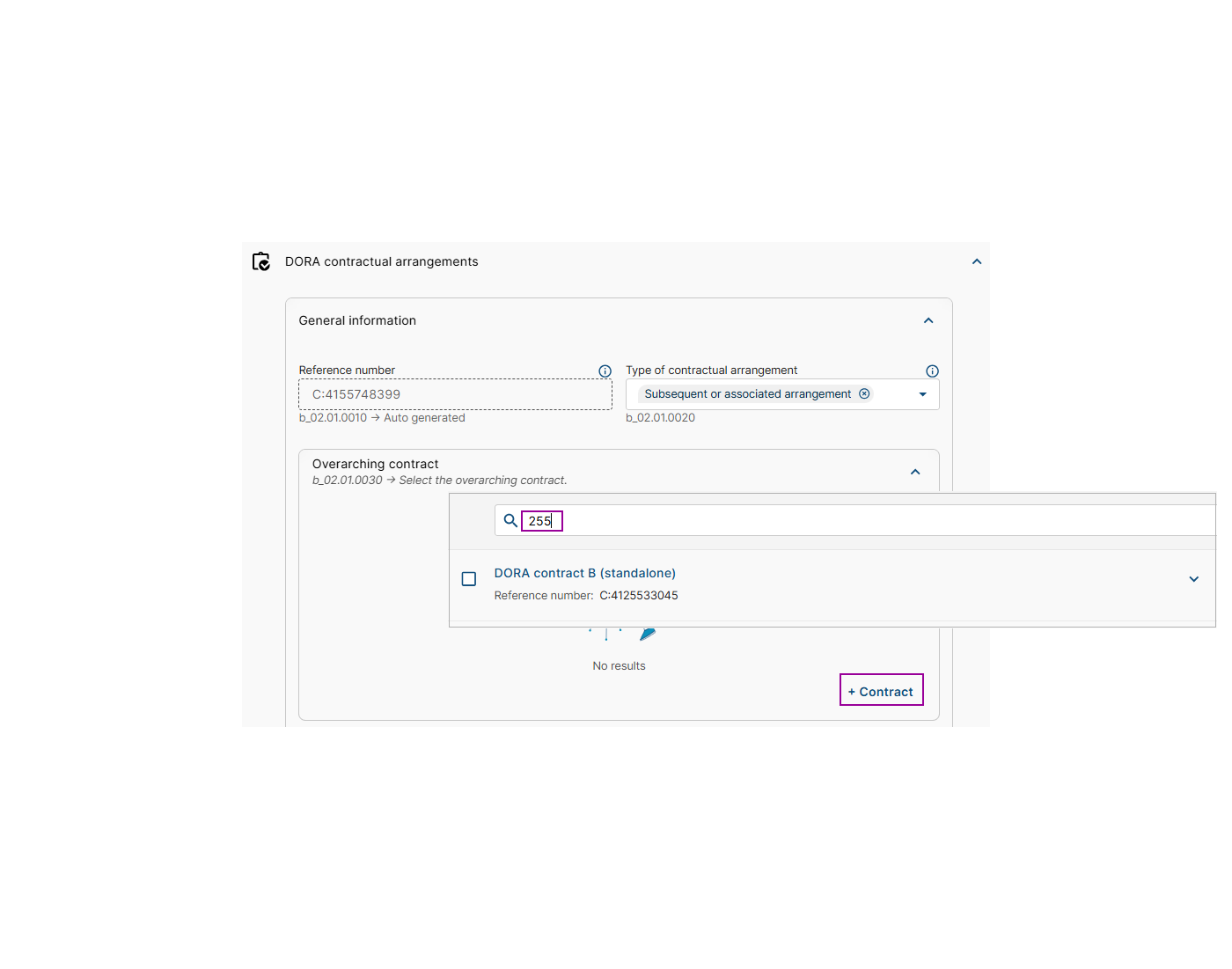 When you're in the search window for contracts, you can now also search by contract ID. This is for example the case if the Type of contractual arrangement is a "Subsequent or associated arrangement". Here, you must add an overarching contract and can now find it by contract ID.