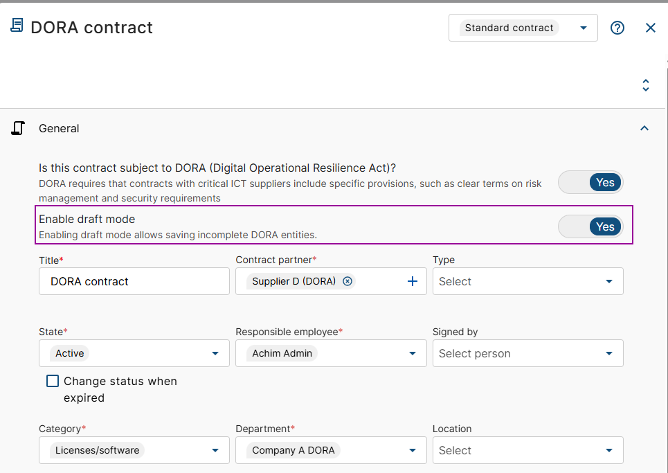 Improved visibility of contracts in "draft" status. A new column, DORA entity state, has been added with information about the DORA-ready status. Draft mode can be activated or deactivated on the contract card under Enable draft mode.