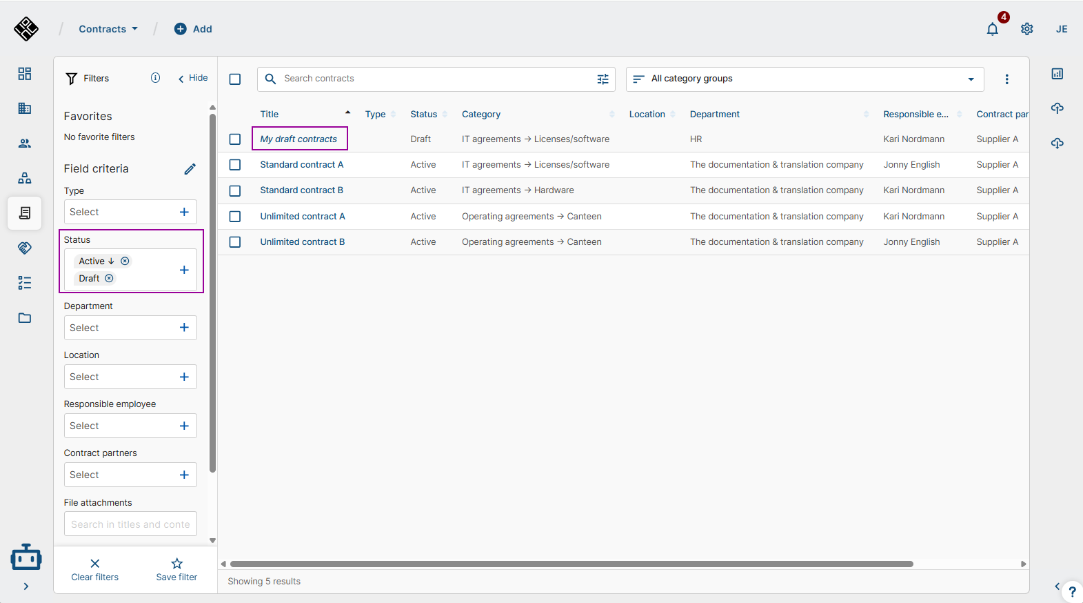 To see draft contracts in the contract list, ensure that they are included in the filter (under Status). Draft contracts are highlighted with italic style.