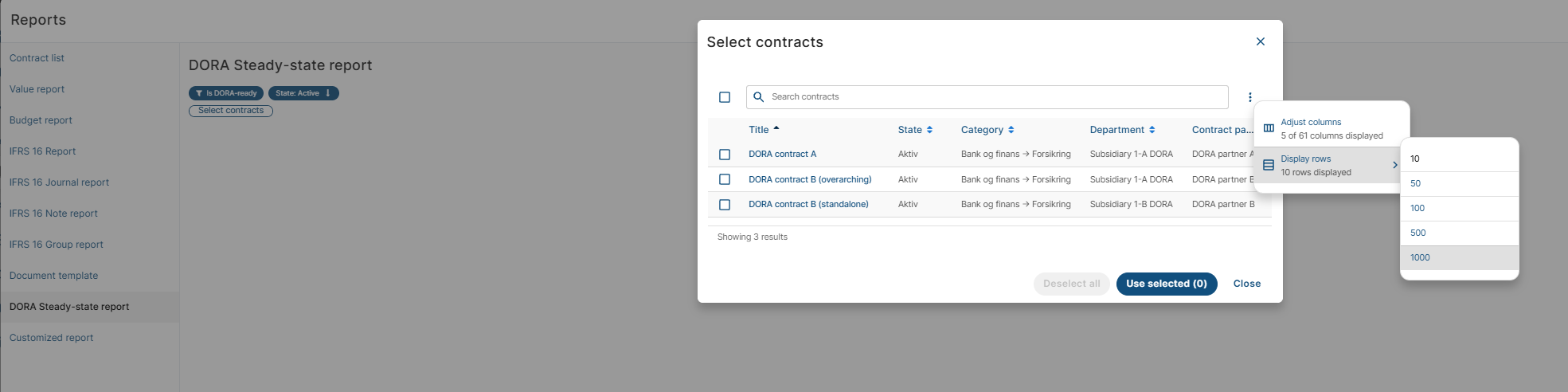 When generating a Steady-state report under Contracts - Reports - DORA Steady-state report, you could previously only select 10 contracts at a time. This limitation has been removed.