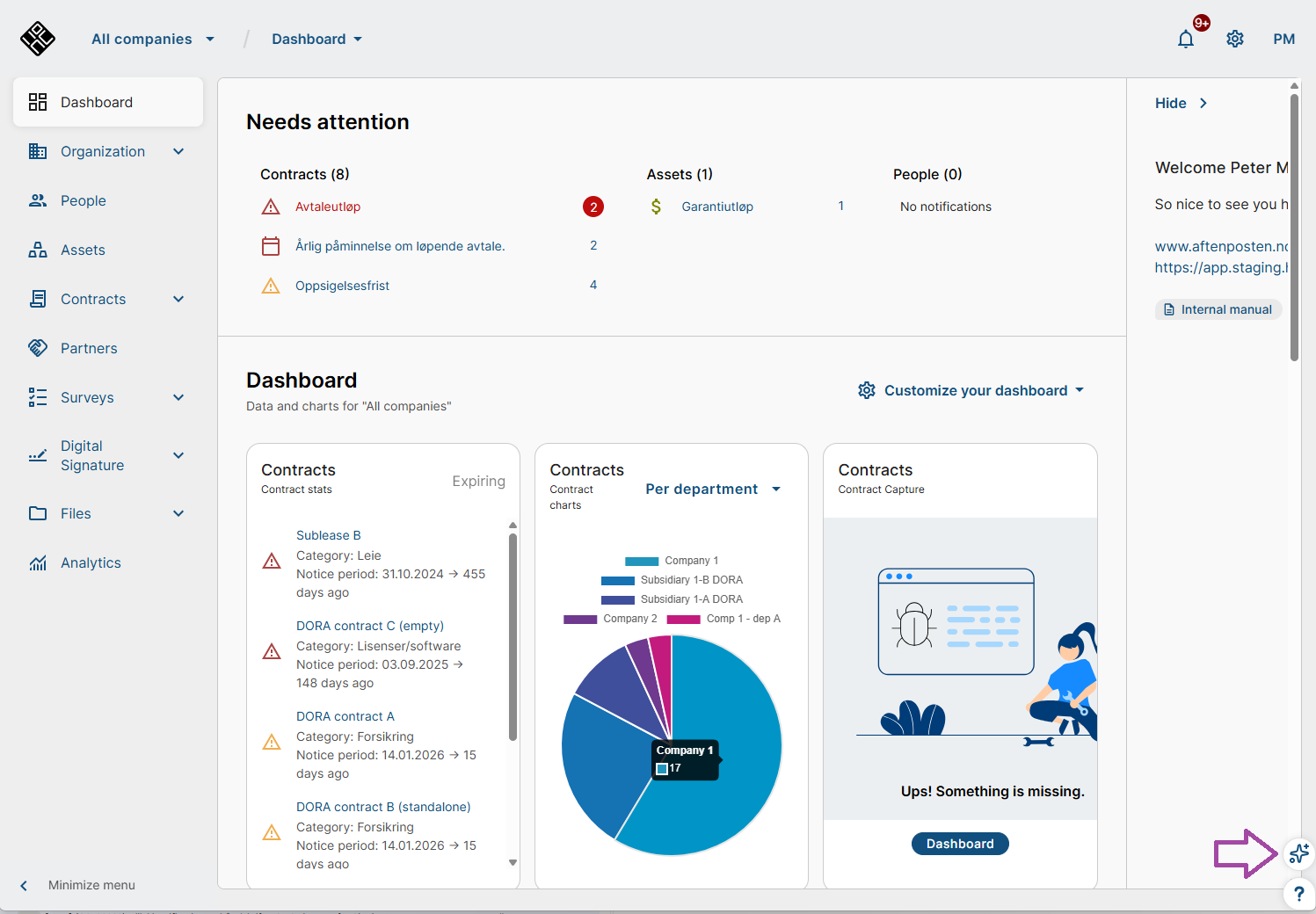 We have launched an integrated AI assistant that allows you to ask questions about the system in "the way you speak". Simply write the way you speak such as "Where do I register a contract" or "How can I add a user".