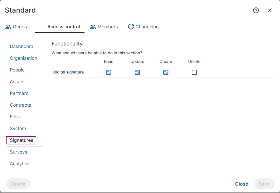 The access control for the Digital Signatures module has a new file path. You can now find it in the user group you want to change under Access Control - Signatures. This also means that it's no longer a requirement to have the Files module activated.