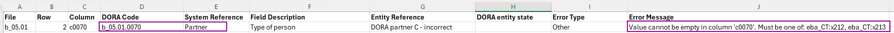 The error validation file now checks the DORA status of a partner to ensure the DORA partner information is entered. If it has not been entered, an error message will prompt you to enter the b_05.01.0010 information. This is done by entering the Name in latin alphabet field in the DORA section on the partner card.