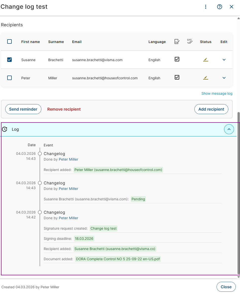 We have implemented an activity log for signature requests. It contains core data of the original request including important changes (e.g. of email addresses, new recipients, etc.).