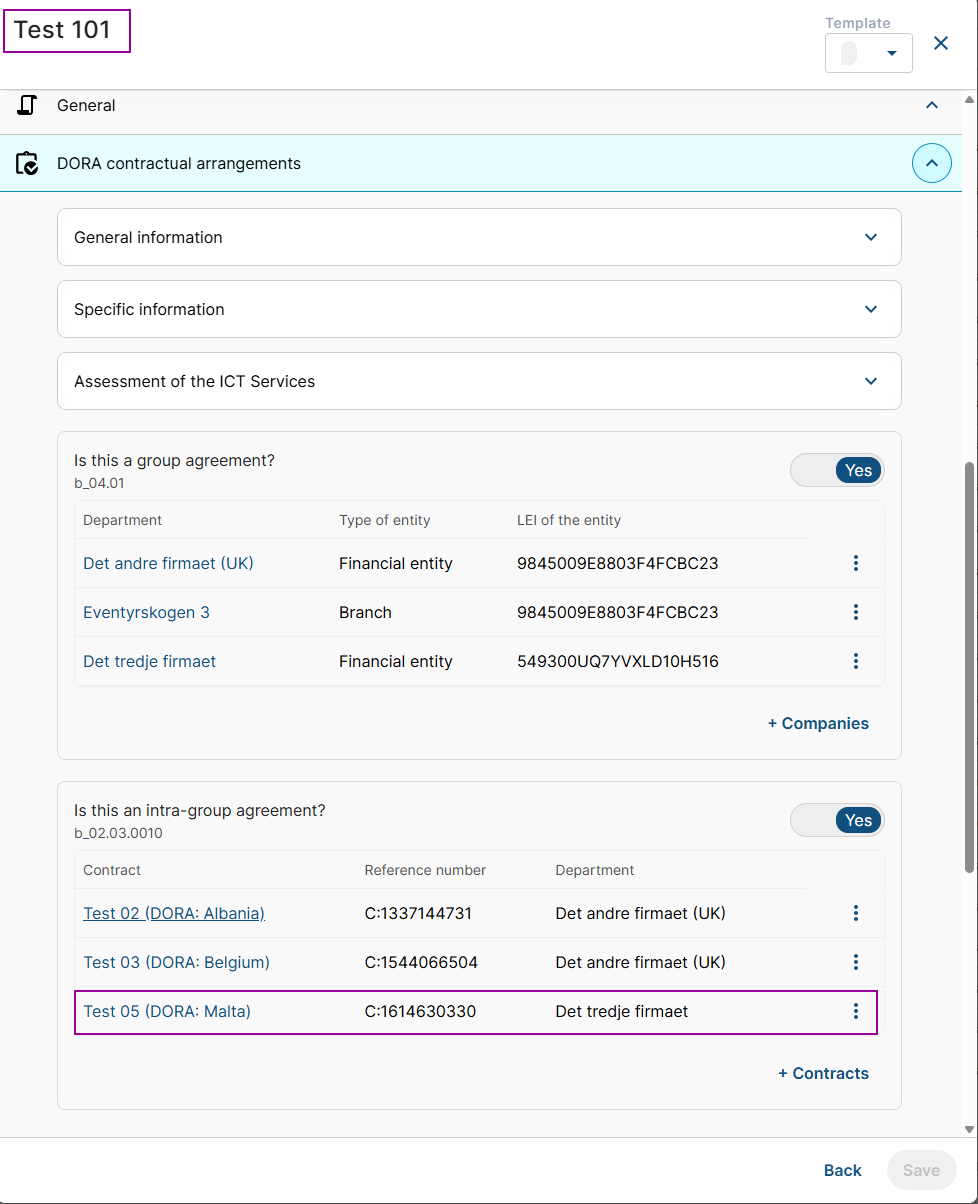 An overarching contract that is the primary contract between a financial entity and an ICT third-party service provider will now display subsequent contracts (entered into by the ICT third-party provider with another ICT subcontractor to support the service delivered to the financial entity). Subsequent contracts are displayed under Related DORA contracts on the overarching contract.