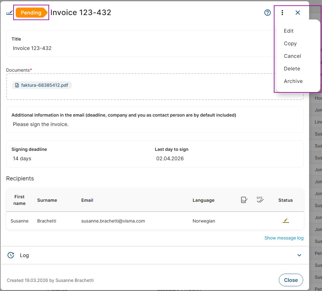 The edit mode for pending signature requests is now consistent with how editing works elsewhere in the system. You can switch to edit mode via the three-dot menu.