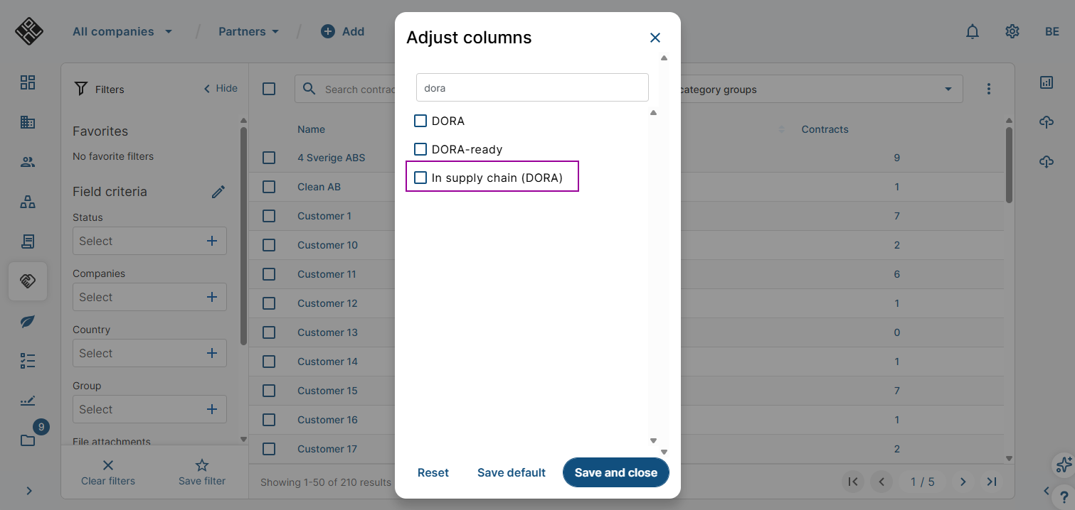 The partner list now contains the new column In supply chain (DORA) informing you that the partner is part of supply chain for DORA reporting.