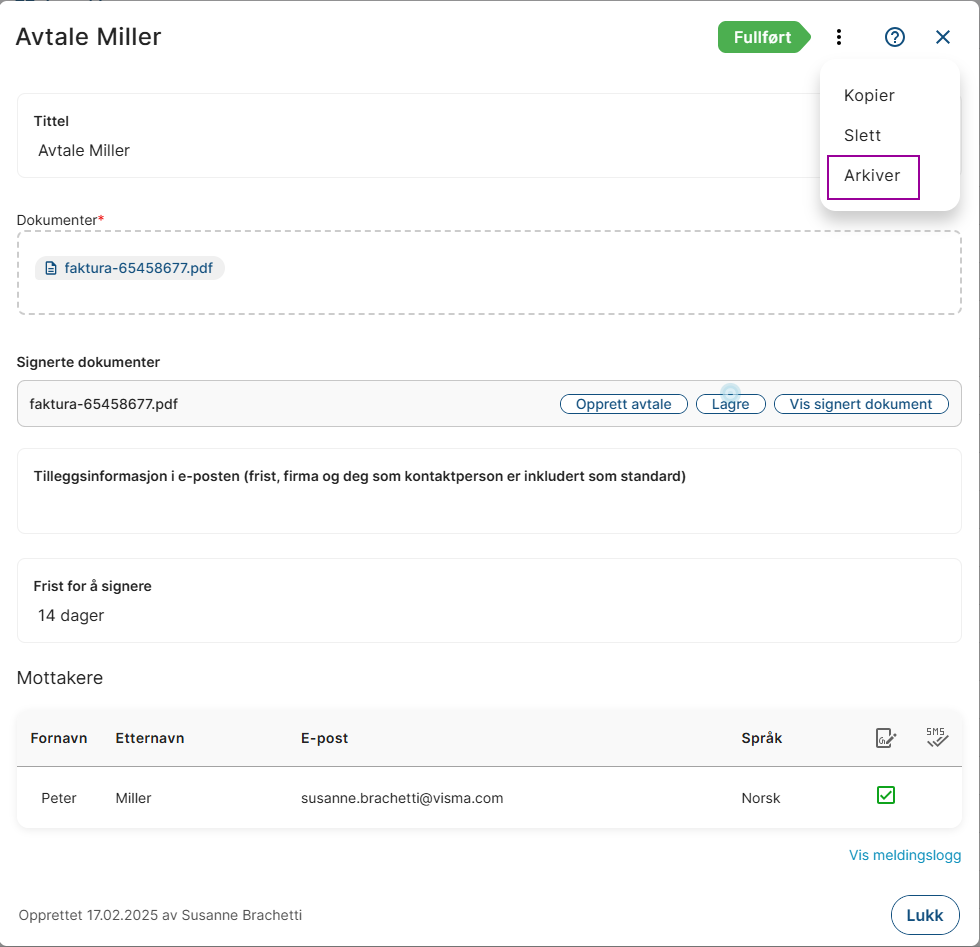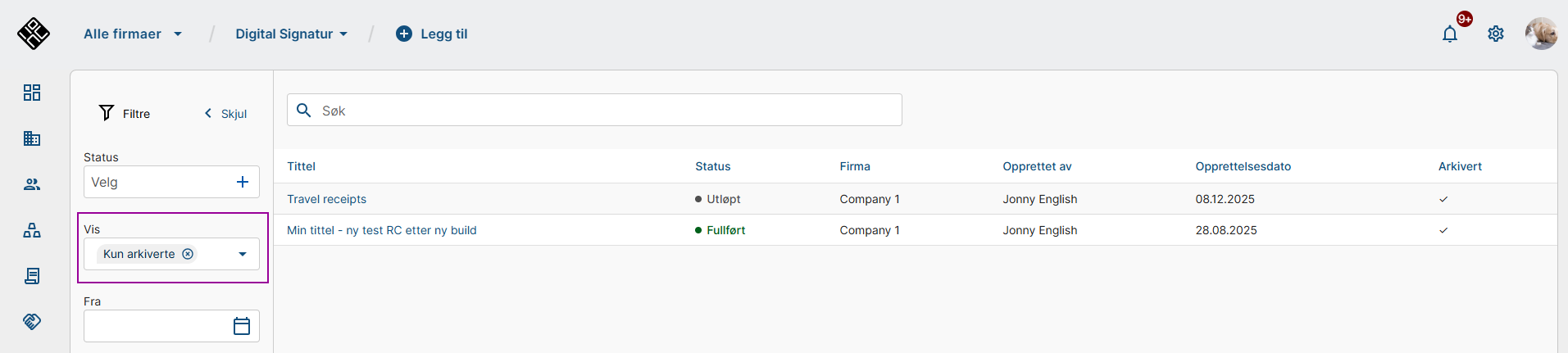 Det er nå mulig å arkivere fullførte signaturforespørsler for å ekskludere dem fra standardvisningen. For dette formålet er filteret utvidet med en ny boks hvor du kan velge om du vil se alle forespørsler, bare aktive forespørsler eller bare arkiverte forespørsler (under Vis).
