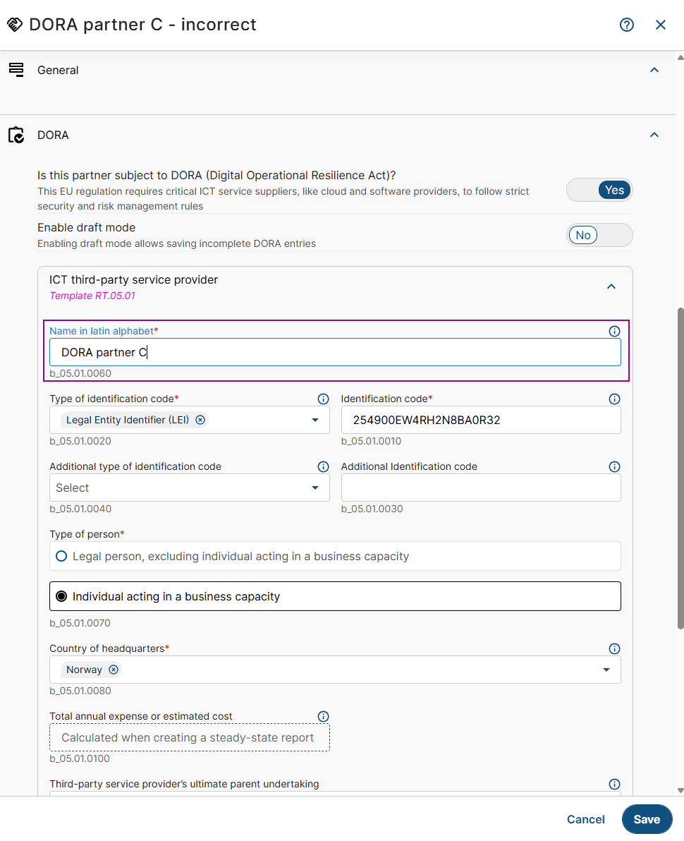 Det sjekkes nå om DORA-partnerinformasjonen er oppgitt. Hvis ikke, informerer en feilmelding deg om å oppgi b_05.01.0010-informasjonen. Du gjør dette ved å oppgi Name in latin alphabet i DORA-delen på partnerkortet.