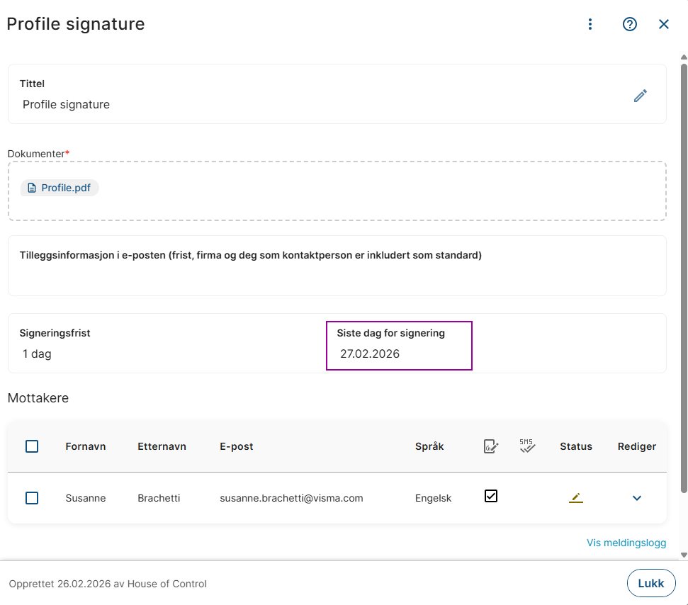 En sendt signatureforespørsel viser nå den konkrete siste mulige datoen for å signere. Tidligere kommuniserte vi bare antall dager.