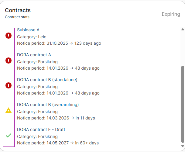 Vi har gjeninnført trafikklys for hendelser i Contract stats-kakkelen for utløpende avtaler på Dashboard. Gult viser hvor mange dager det er igjen til utløpet, grønt viser at det er mer enn 60 dager igjen til utløpet, og rødt viser hvor mange dager det har gått siden avtalen utløp.