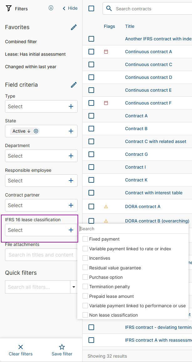 Du kan nå filtrere etter IFRS leieklassifiseringen for IFRS-avtaler. Dette kan gjøres på to måter: