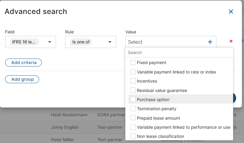 Avansert søk ovenfor listen med avtalene: Velg «IFRS 16-leieklassifisering» kombinert med «er en av», og deretter ønsket klassifiseringstype