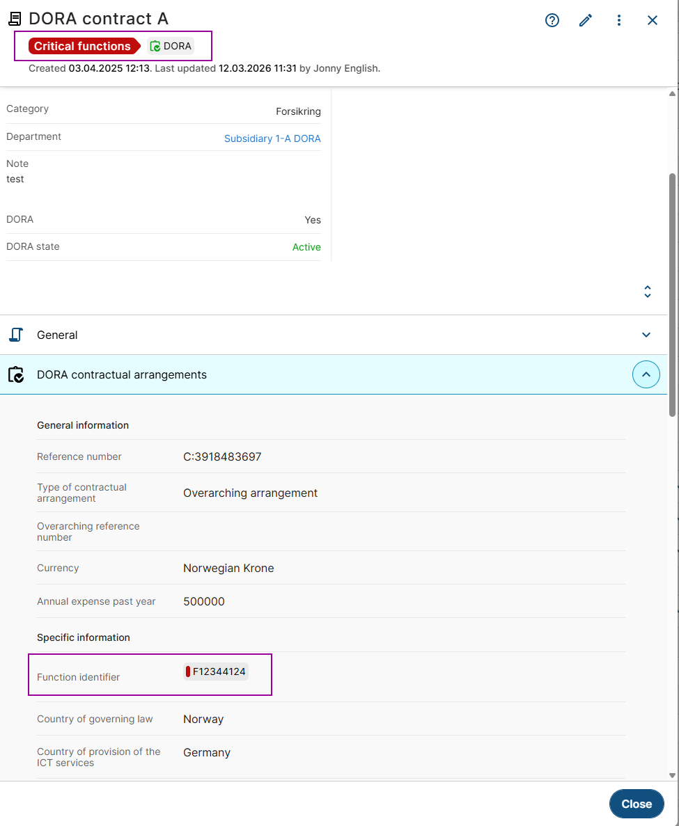 Kritiske funksjoner er uthevet i avtalens overskrift. De nøyaktige funksjonene finner du lenger ned under DORA contractual arrangements.