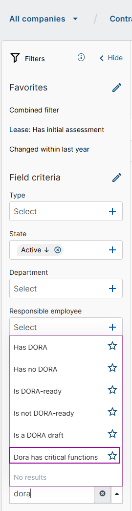 Vi har fjernet DORA-utkast fra filteret DORA-ready. Filteret viser derfor nå kun avtaler med nødvendige DORA-oppføringer på plass.