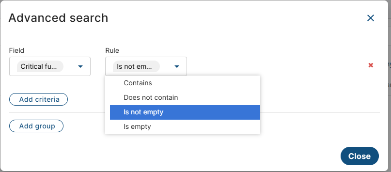 Avansert søk inneholder også et filter for kritiske funksjoner: Velg Kritiske funskjoner kombinert med «er ikke tom».