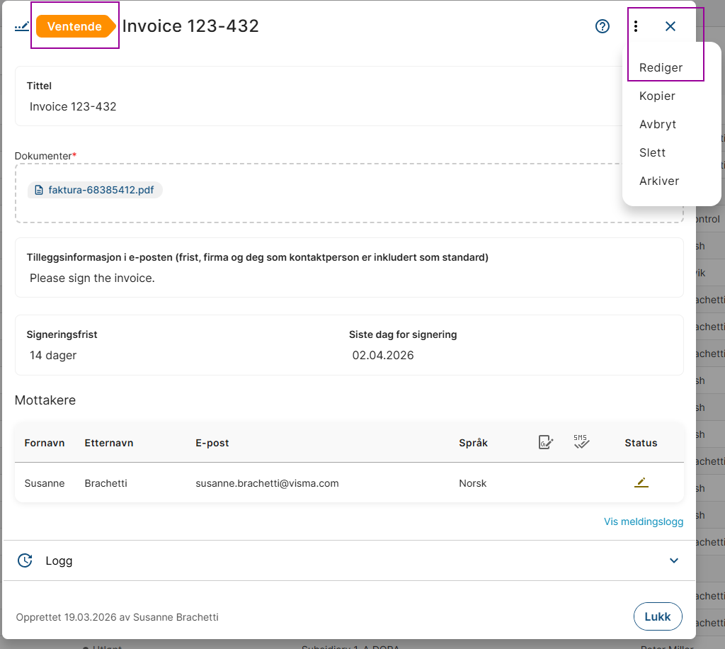 Redigeringsmodus på ventende signeringsforespørsler er nå tråd med hvordan redigering fungerer andre steder i systemet. Du bytter til redigeringsmodus via tre-punktsmenyen