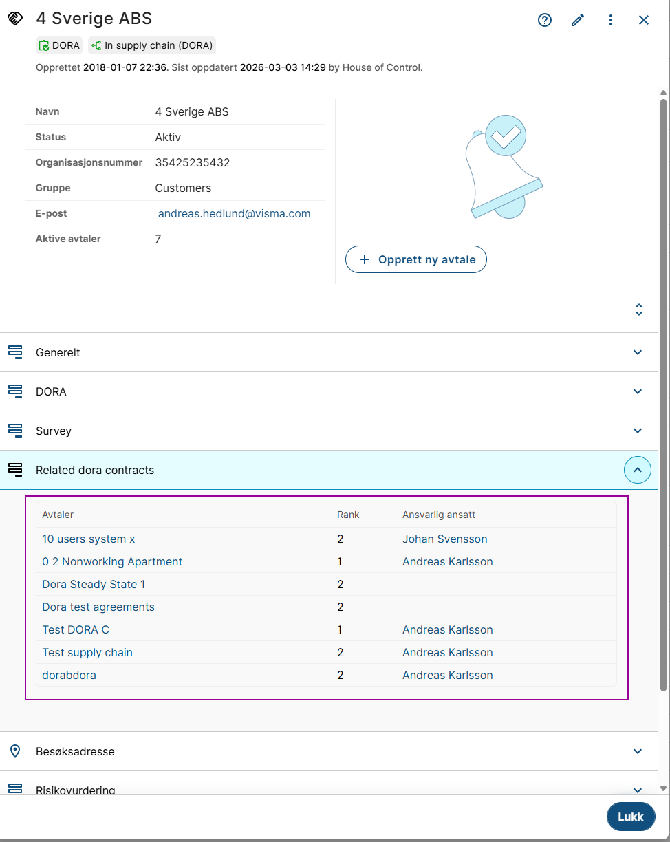 Du finner de tilknyttede avtalene på partnerkortet under «Related DORA contracts» hvis dette avsnittet er definert i løsningen din. Kolonnen «Rank» angir om dette er hovedleverandøren eller en underleverandør. Hvis ikke, ta kontakt med din kontaktperson i House of Control AS.