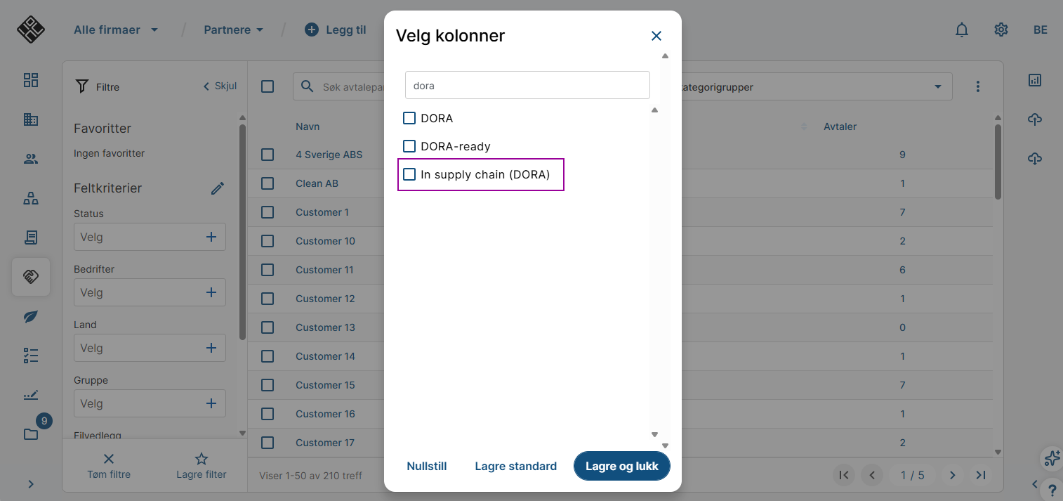 Hvis du ikke ser kolonnen DORA-ready i avtalelisten, kan du endre dette i kolonneoppsettet (-ikonet øverst i høyre hjørne).