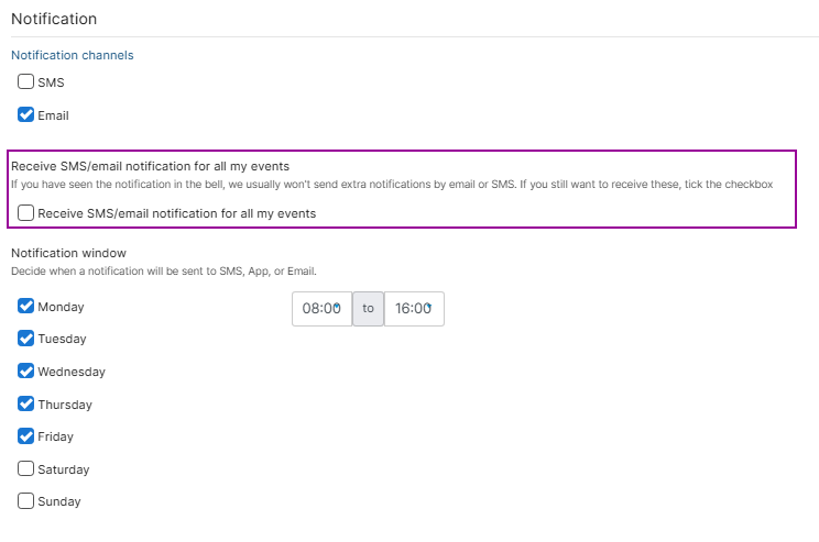 However, sometimes you may forget that you have already seen the notification. Therefore, you can now define in your user setttings that you also want to receive SMS/email notifications when you have already seen it under the bell. Read more here.